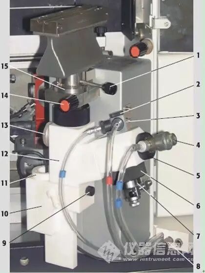 √将火焰原子化器上的燃烧头/雾化器/撞击球拆下,并将连接气管、连接电缆拆下。